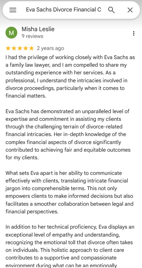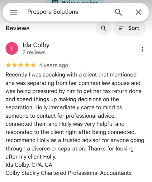 "It was absolutely excellent working with Joyce. She is highly professional, this is clearly her area of expertise and something she is passionate about. I highly recommend her to anyone needing assistance organizing their finances, future projecting, and more, in the event of separation/divorce.